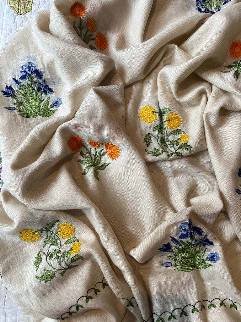 A garden in Kashmir in all its glory. Hand-embroidered on pure cashmere it takes you into the dream that is India