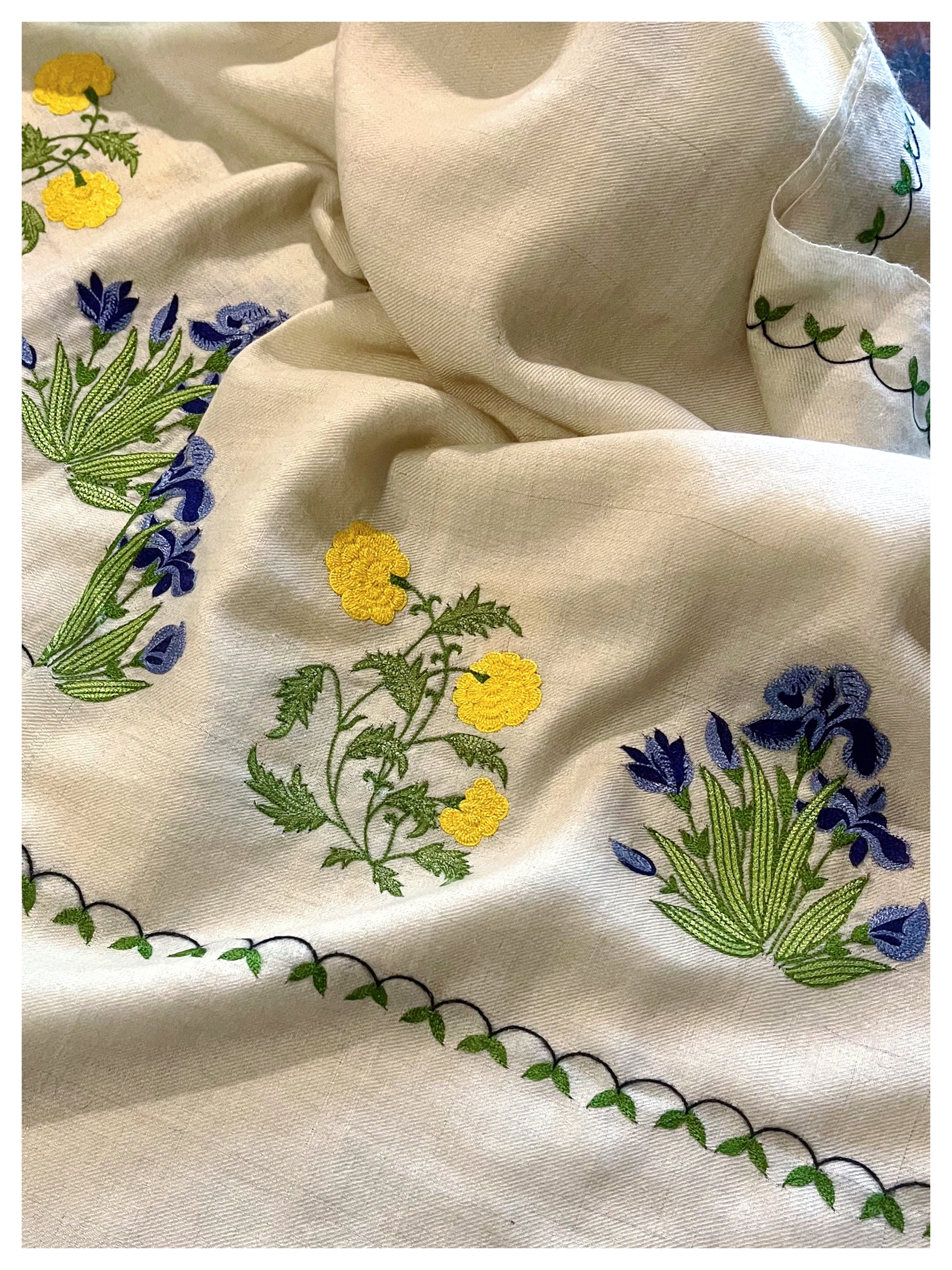 A garden in Kashmir in all its glory. Hand-embroidered on pure cashmere it takes you into the dream that is India